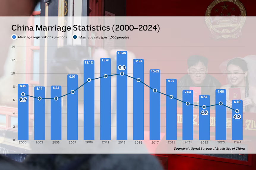 过去十多年里,中国结婚人数一路下滑,从2013年的1347万对跌至2024年的610万对,跌幅近乎腰斩。