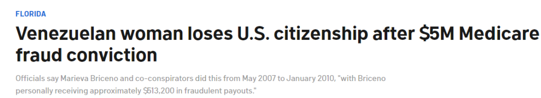 佛罗里达州近日出现一起震动移民与医疗系统的大案。一名委内瑞拉裔女子因诈骗联邦医疗保险(Medicare,俗称“红蓝卡”)超过540万美元,被定罪入狱;服刑结束后,美国司法部进一步出手,将她的美国公民身分正式撤销。