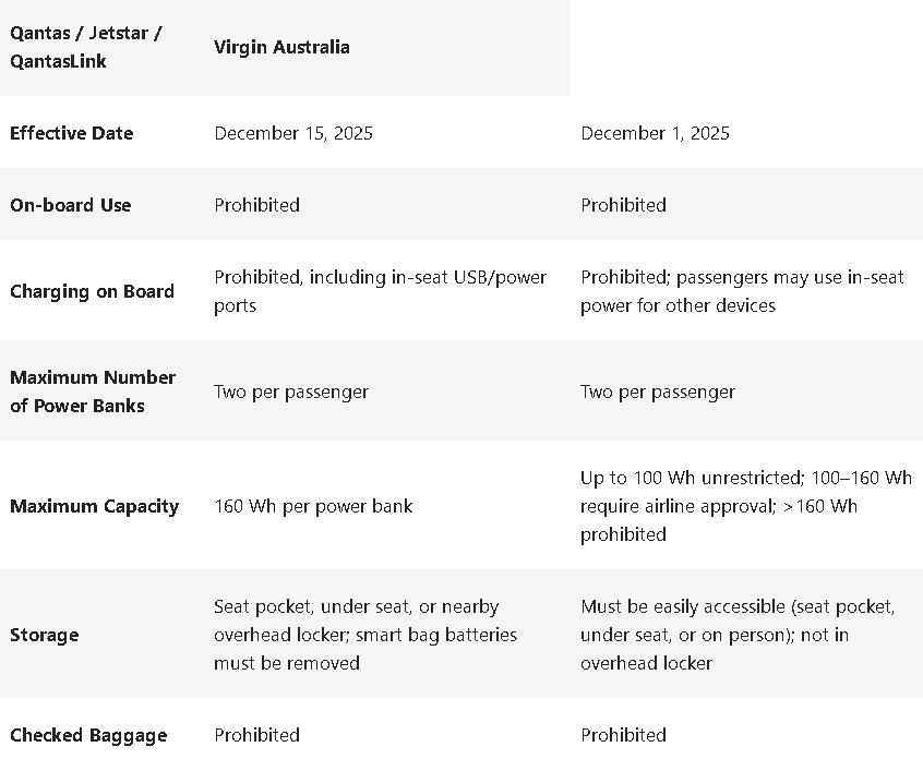 简单说就是:以后坐澳洲航班,你的充电宝可以带,但不能用,也不能托运。最好放在前方座椅下或座椅口袋里,不要放头顶行李架。如果你习惯在飞机上用充电宝给手机补电,那以后就只能依赖航空公司的座位电源了。