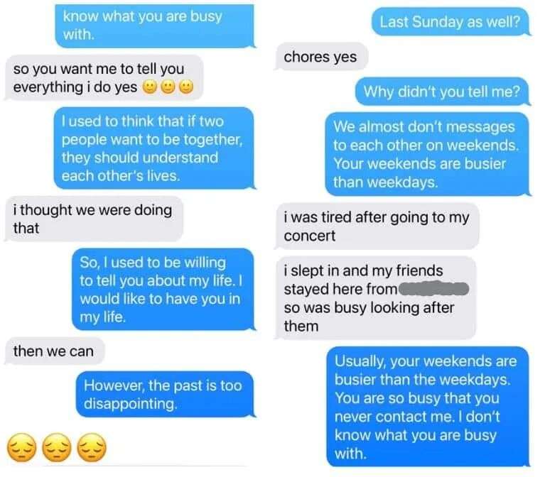 "我们开始几乎每天都见面。但每到周末,他就会消失,不打电话、不发短信。接着,到了周日晚或周一早上,他又会准时出现,并给出合情合理的解释——骑摩托旅行、搬家、朋友来访、加班之类"。