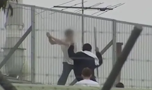 一群年龄在12至17岁的男性被拘留者爬上屋顶,手持棍棒、撬棍和灭火器,向下方执法人员投掷杂物。