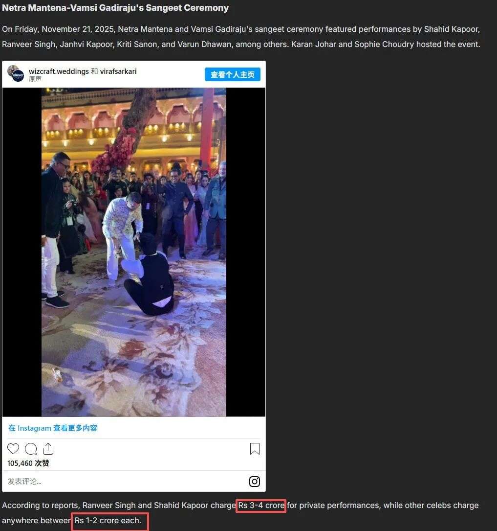 从婚礼策划公司Wizcraft发的现场物料看,这场婚礼的花费可是不一般,奢华程度堪比2024年印度首富安巴尼家族的婚礼,被媒体形容为“百万美元婚礼”,讨论度关注度极高。