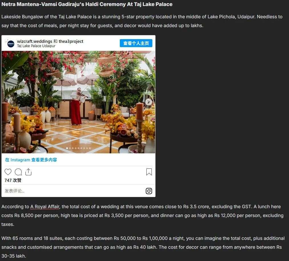 这周末,印度亿万富翁、制药大王拉朱·曼特纳的女儿内特拉,在印度拉贾斯坦邦的乌代浦尔出嫁了!