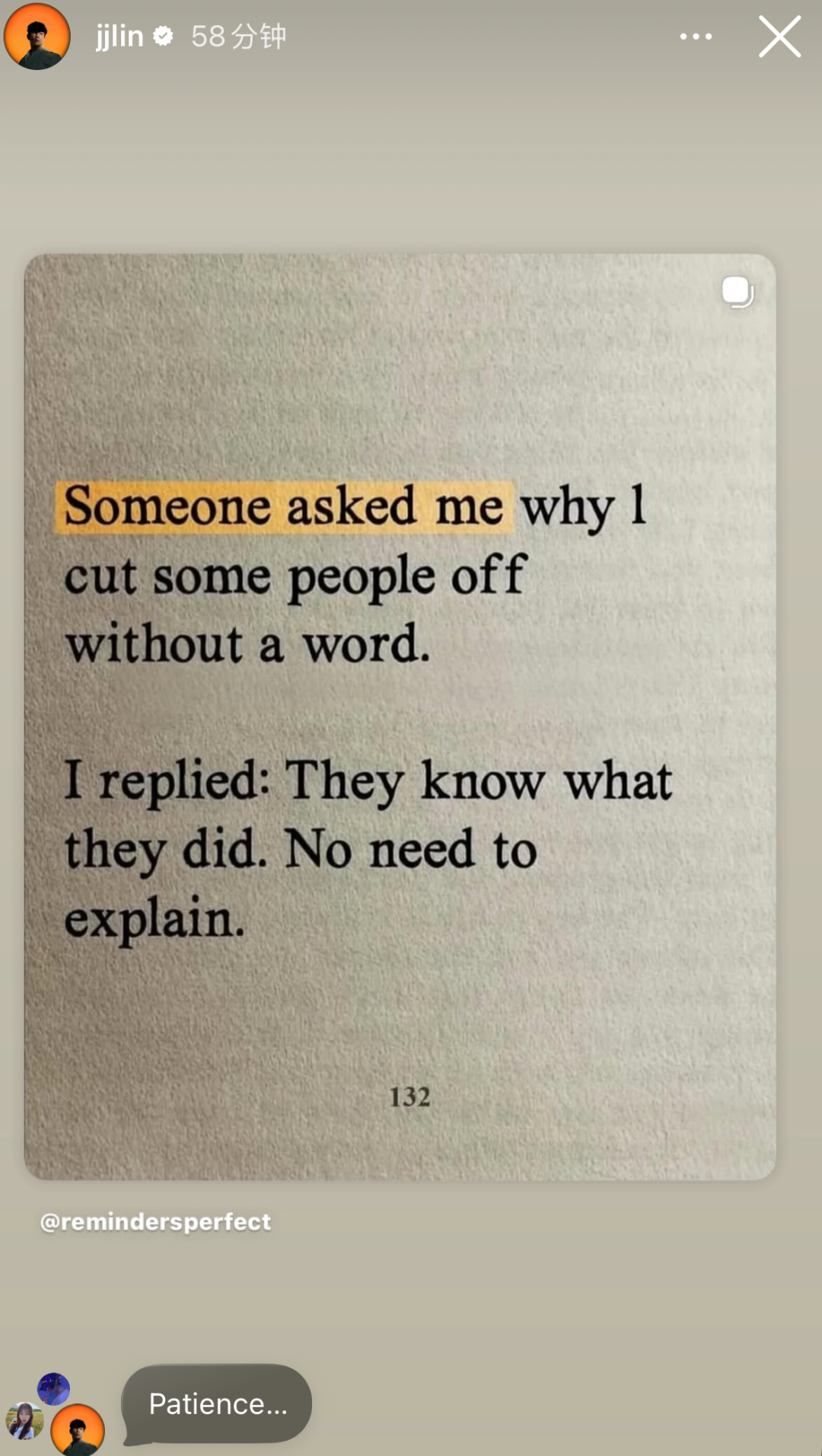 有网友在洛杉矶偶遇林俊杰与一女生出行,引发恋情猜测。刚刚,林俊杰更新动态,配图上写着:“有人问我为何悄无声息地与某些人断绝来往。我答道:他们心知肚明,无需多言。” 随后又在评论补充:“耐心……”