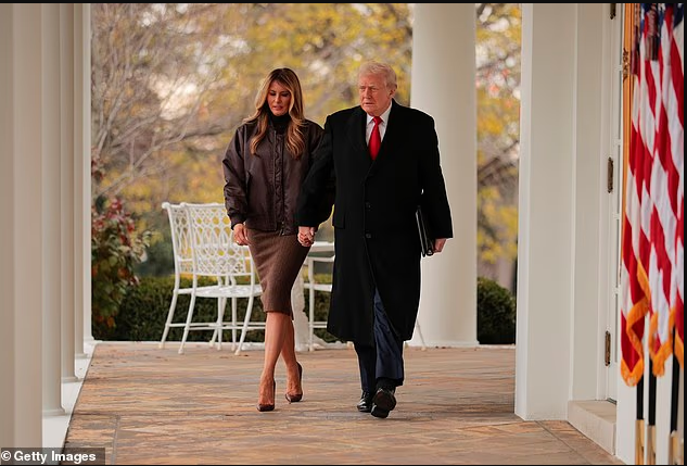 第一夫人梅拉尼娅也出席了典礼,身穿皮革飞行员夹克、黑色高领衫和人字纹裙,气质依旧亮眼。