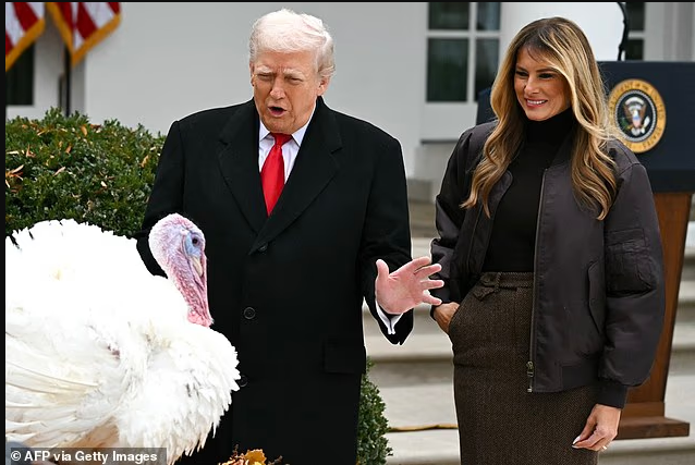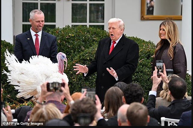在白宫玫瑰园,川普举行了他任期内最新一场“感恩节火鸡赦免仪式”。今年被赦免的两只火鸡名叫 Gobble 和 Waddle,都是体重超过50磅的“超大号火鸡”。整个活动不仅遵循传统仪式,也充满川普式幽默,全场笑声不断。