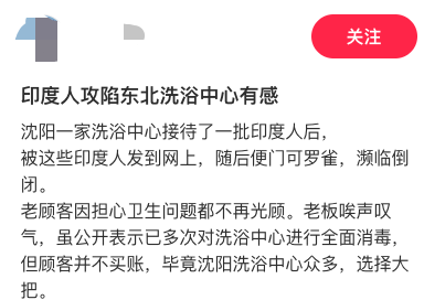 事情是这样的:一位博主发帖感慨,说沈阳一家洗浴中心接待了一批印度顾客后,被拍视频传到网上,结果从原本的门庭若市变成门可罗雀,老板都快愁秃头了。