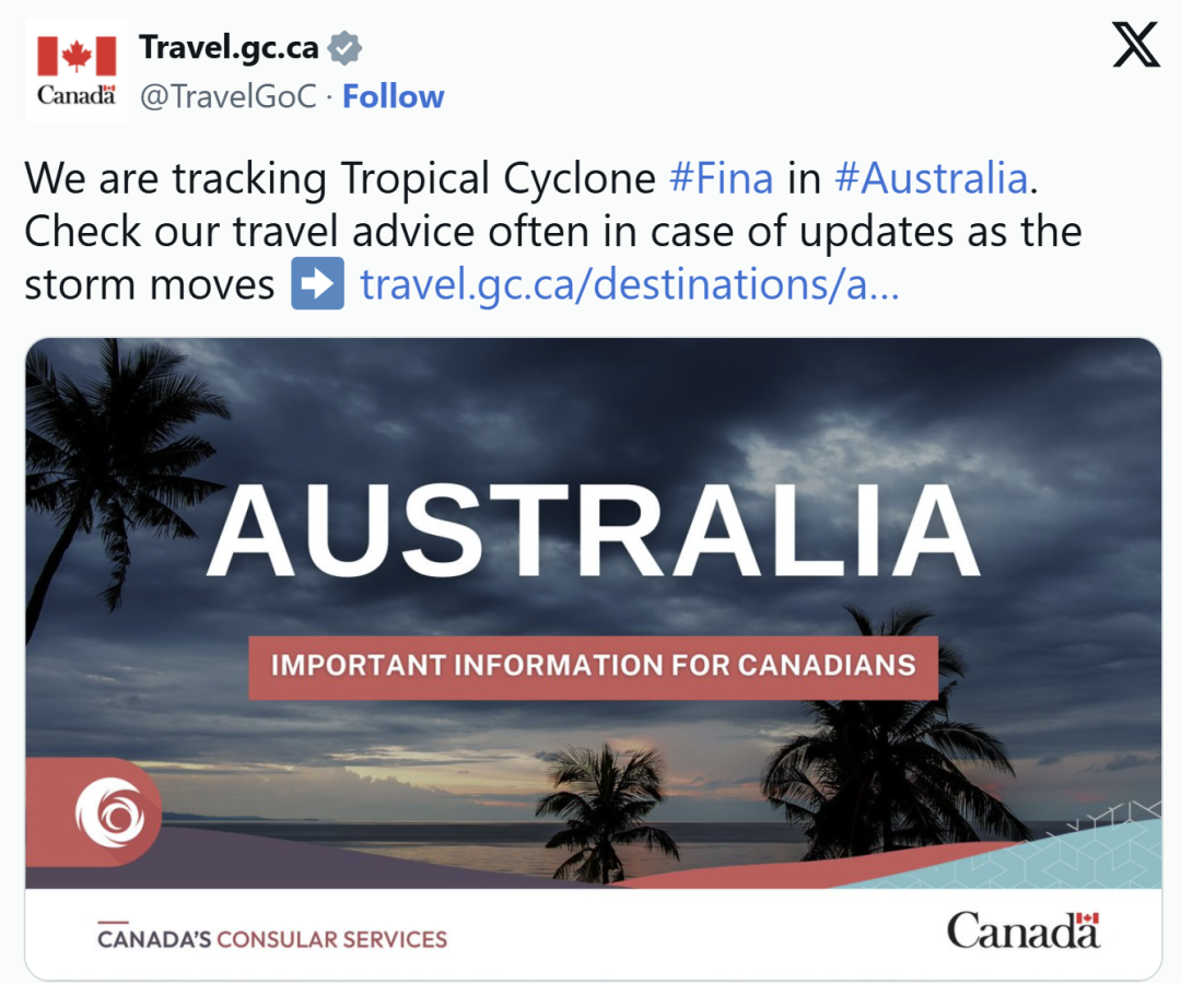 11月23日,加拿大政府更新了澳大利亚旅行建议,主要是天气原因,热带气旋菲娜(Fina Cyclone)正袭击北澳、金伯利海岸,风力高达205 km/h;