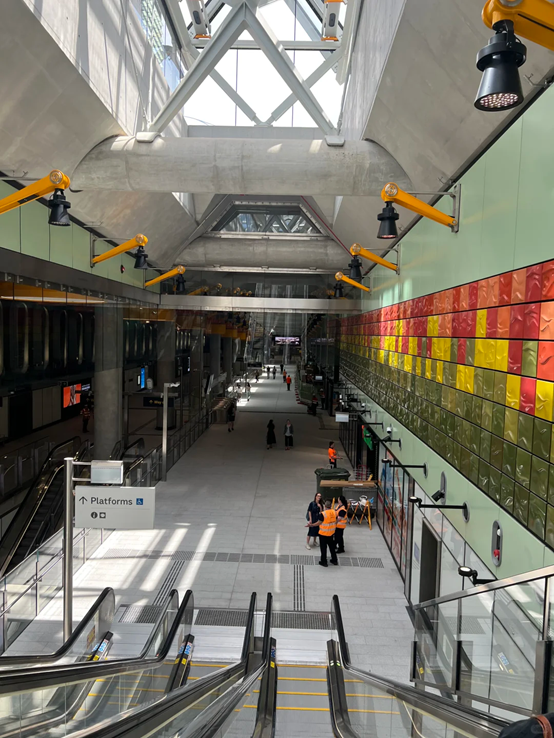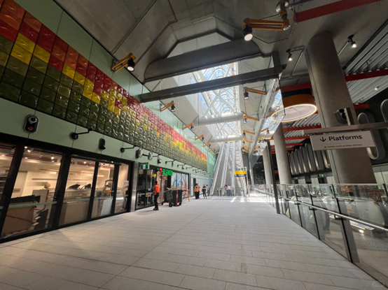 同时,艺术作品也融入站内空间,Danie Mellor创作的“Forever”壁画向Wurundjeri Woi Wurrung女性在墨尔本历史中的贡献致敬,Maree Clarke的“Barerarerungar”玻璃装置展现传统风景和线条艺术,赋予车站独特文化气息。