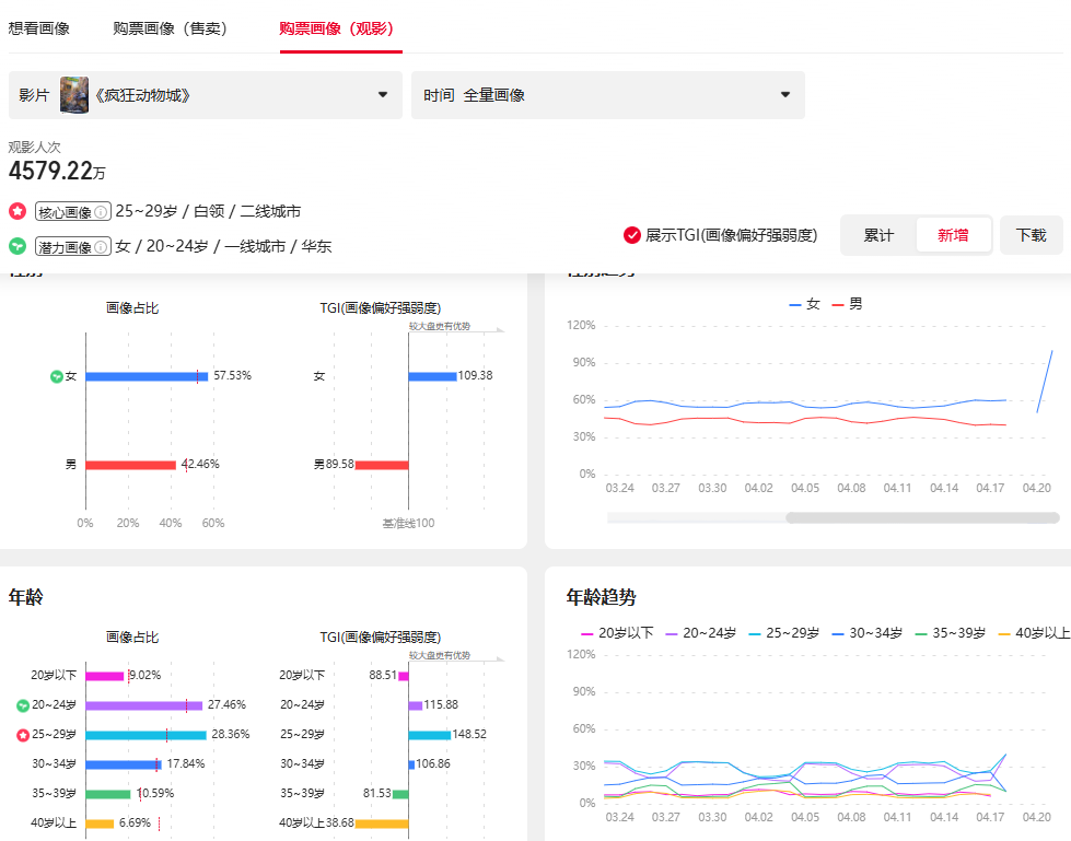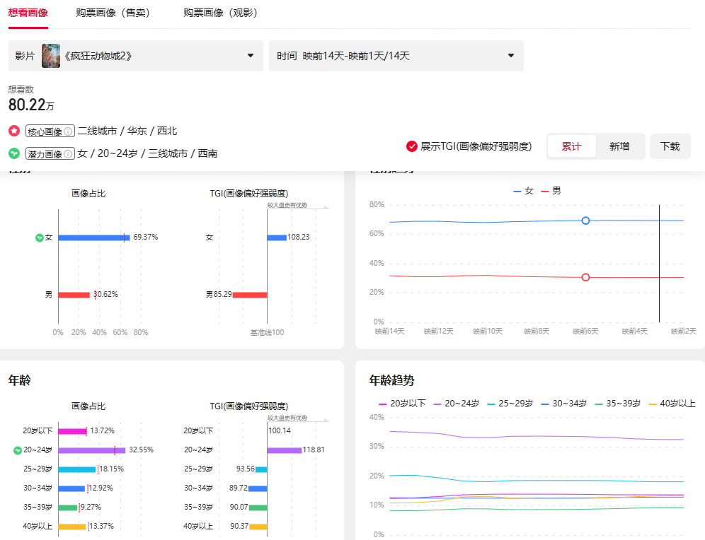 然而在《疯狂动物城2》的“想看”用户画像中,这一结构已悄然生变:00后乃至10后观众比例显著上升,原先的85后主力群体占比相对下降;同时,观众地域分布也从一二线进一步向三四线城市下沉。