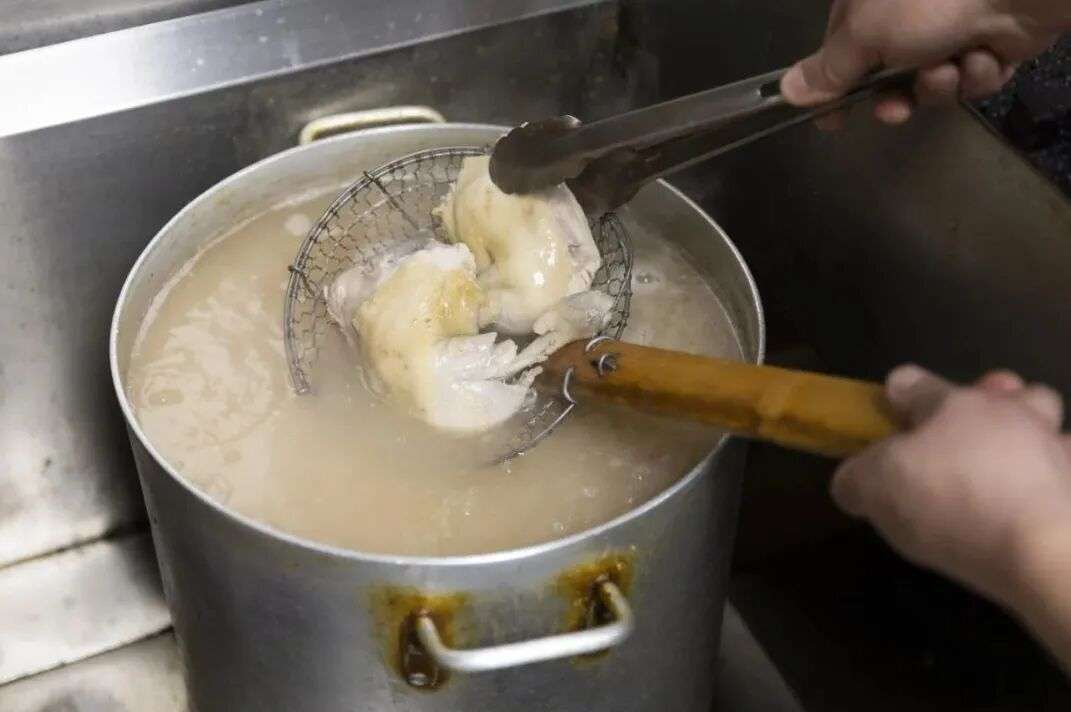 不是蘸的,是和肉馅一起包进饺子里。店里用鸡熬制高汤: