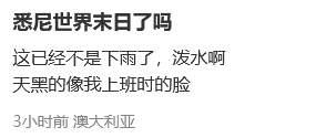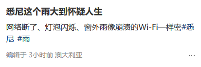 有不少网友吐槽:“悉尼这个雨大到怀疑人生”“悉尼世界末日了吗”。