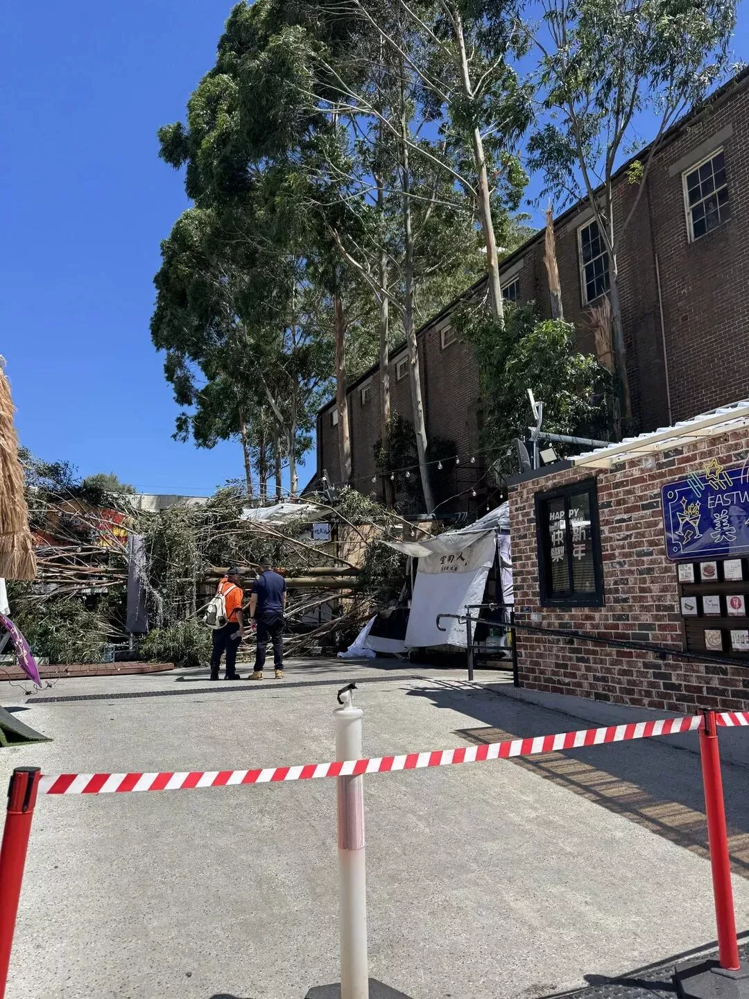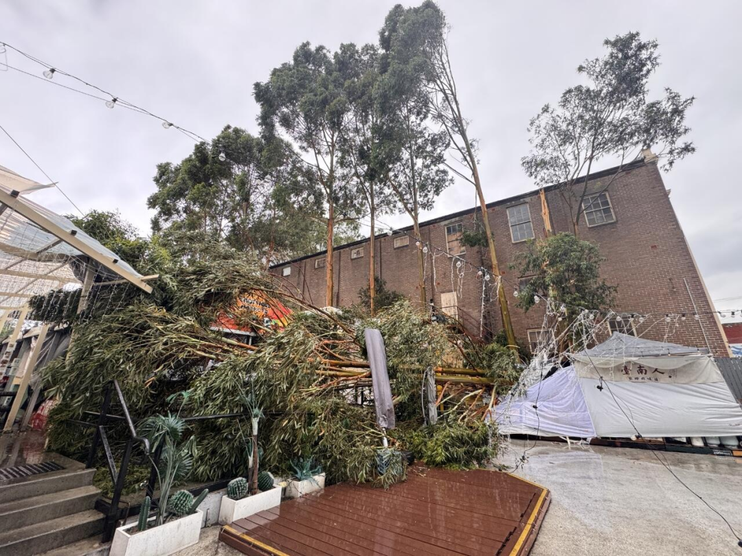 现场照片显示,当地华人常去的Eastwood Market受到严重影响,临时关闭,倒塌的大树还砸到建筑上,引起建筑受损。
