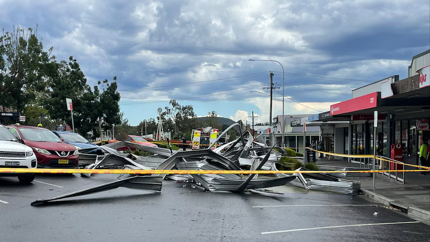 在新州小镇Kurri kurri,一处商铺的铁皮屋顶被大风掀起,重重地砸在街道上,险些造成人员伤亡: