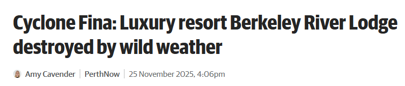 据《PerthNow》11月25日报道,西澳北部一家豪华度假村在热带气旋“Fina”袭击后遭受重创,暴雨狂风几乎将其摧毁。