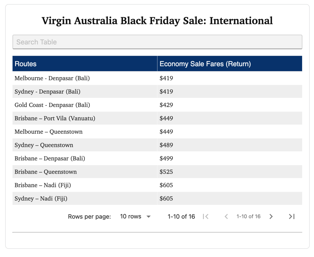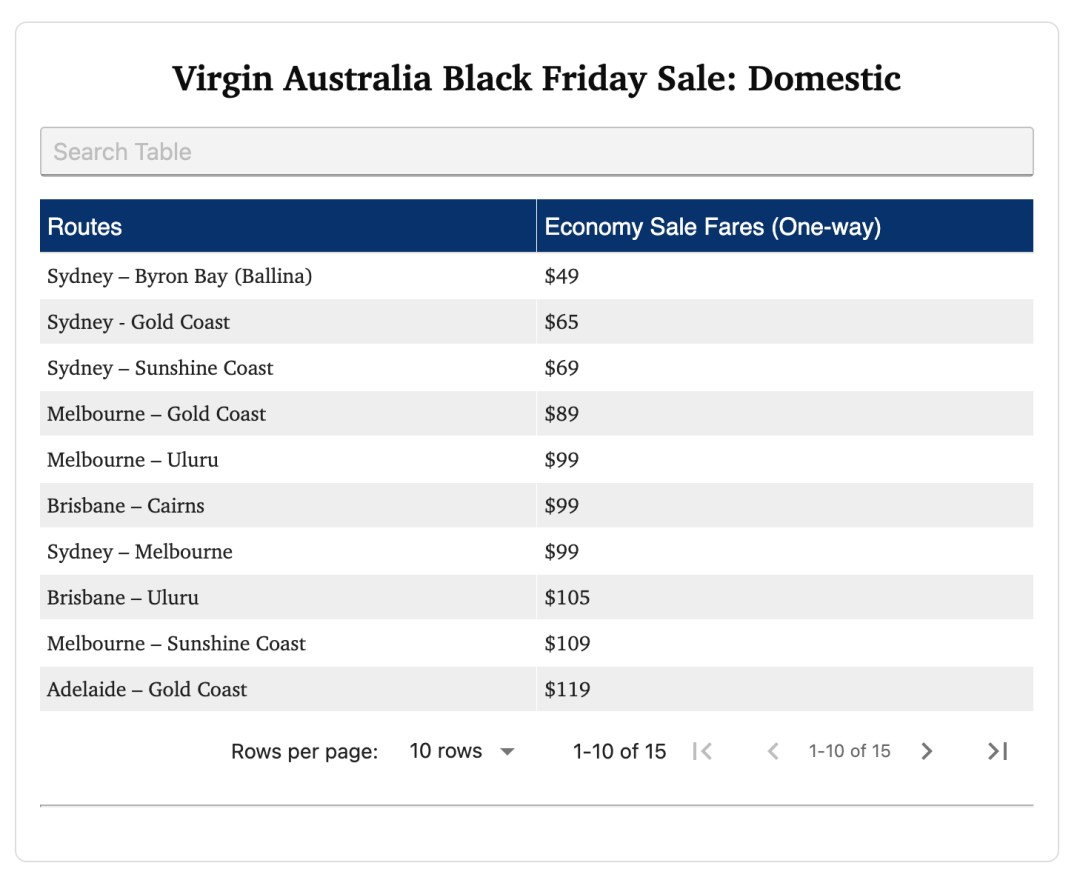 另一边,Virgin Australia 直接加入战局,推出 低至 $49 的 Black Friday 超级促销,部分机票价格甚至比过去最低价还低。例如悉尼至 Byron Bay 仅需 $49,悉尼至黄金海岸 $65,墨尔本至乌鲁鲁 $99。国际航线同样大幅降价,包括墨尔本/悉尼至巴厘岛 $419,布里斯班至斐济 $605 等,覆盖巴厘岛、斐济、皇后镇、瓦努阿图等度假胜地。此次促销从 11 月 25 日起通过 Virgin App 提前开启,全网促销将从 11 月 26 日持续到 12 月 2 日,涵盖 2026 年 1 月至 9 月期间的旅行。