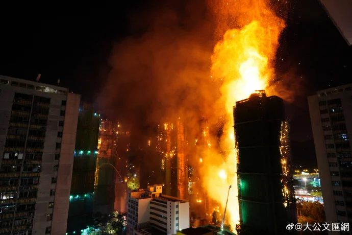从网路上流传的影片及照片中可以发现,多栋相邻的大楼被火光与浓烟笼罩,其中几栋上搭着的棚架,被大火烧毁后不断脱落坠下。