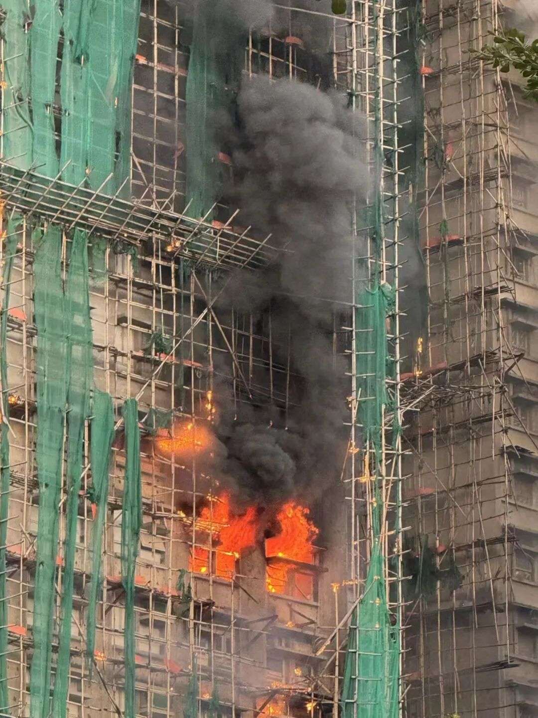 因为近期大楼在做维修,八栋楼外墙全包着棚架,风又特别大,现场像被点了好几处,一幢接着一幢地被卷进去。