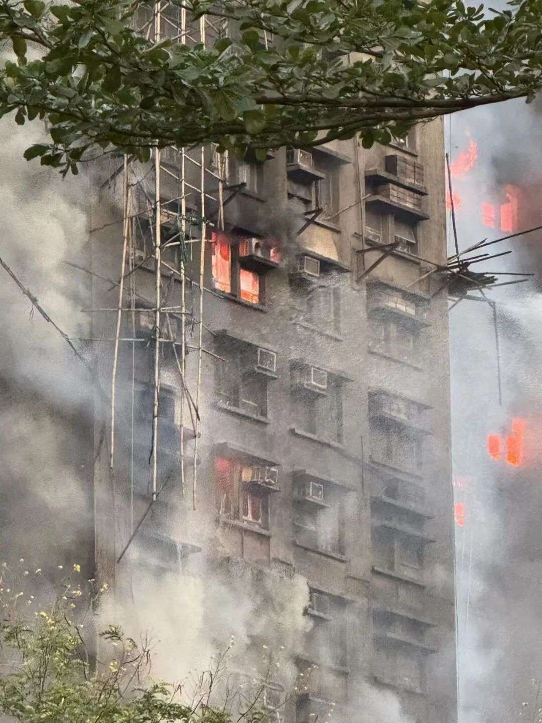 下午三点左右,附近的居民已经在街上闻到焦味。有人正准备去接孩子放学,一抬头就看到整片楼体在冒烟,接着火光直接蹿到十几层楼高。