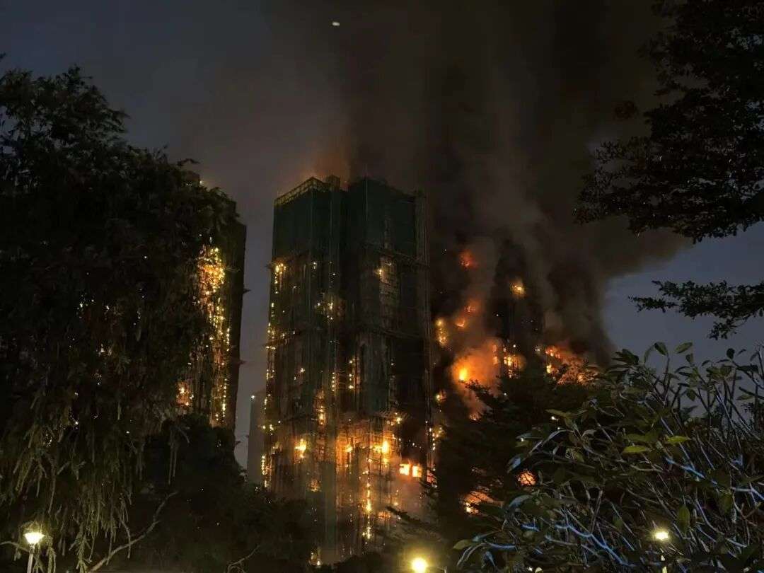 火势最初由外墙棚架起火,在强风及“烟囱效应”推动下迅速向上及向周边建筑物蔓延,造成七栋大楼先后起火。