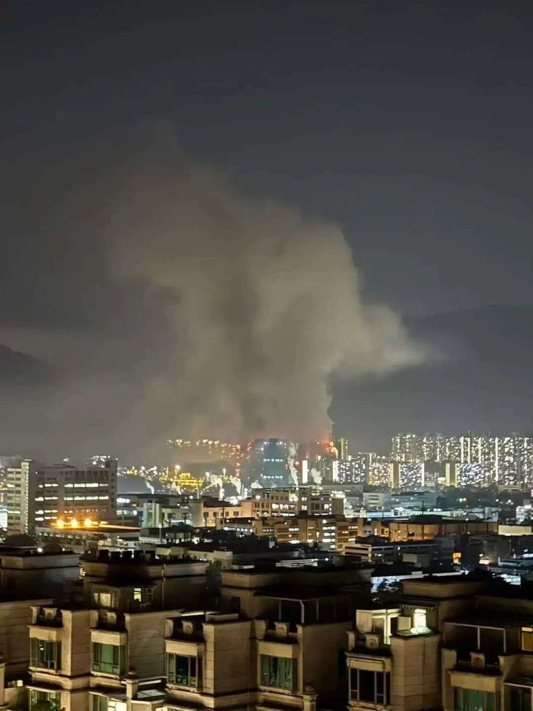 到了深夜,大火仍未完全扑灭,但局部火势已经被压住。大量浓烟仍往天上飘,消防在不同楼层继续做内攻和降温,避免再次复燃。
