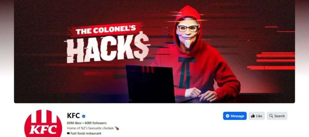 比如KFC官网菜单里依然能看到“Hacker”特价,Facebook 主页上那位“黑客上校”也还站在最显眼的地方。