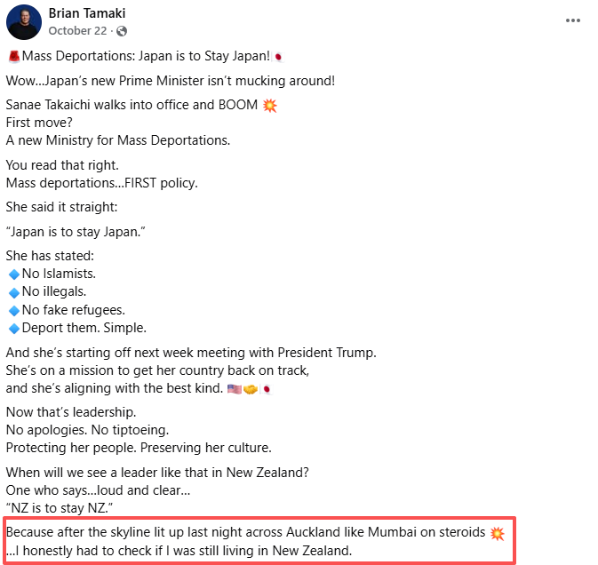Tamaki发帖时恰逢印度排灯节——他称:“昨晚奥克兰夜空亮得像‘打了激素的孟买’……我真的有一瞬间怀疑自己是不是还住在新西兰。”