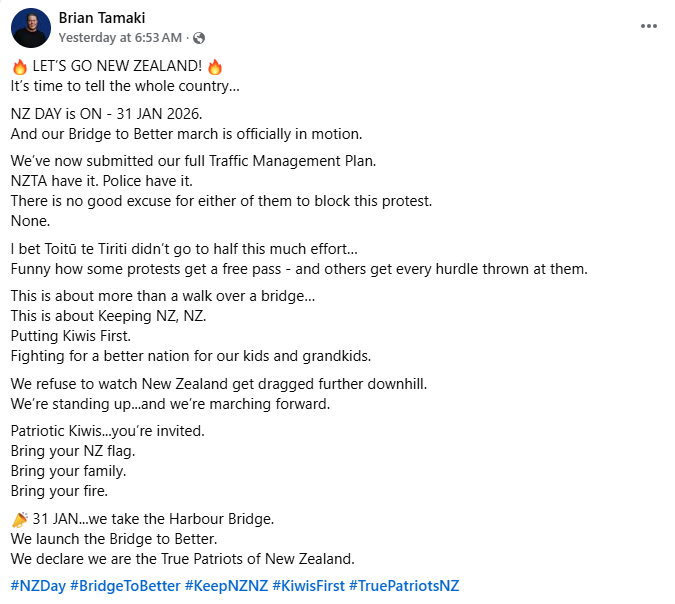 帖文最后,他公开向所谓的“爱国新西兰人”发出邀请,呼吁大家携带国旗、带上家人“上桥”,并宣称1月31日将是他们“宣示自己是真正新西兰爱国者的时刻”。
