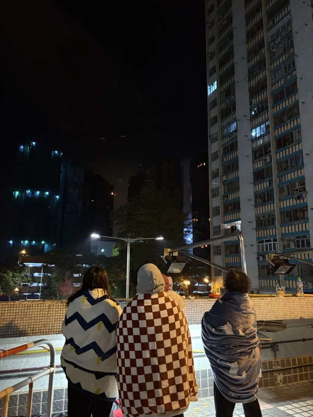 广福商场二楼露天广场,被疏散居民裹着毛毯观望火势