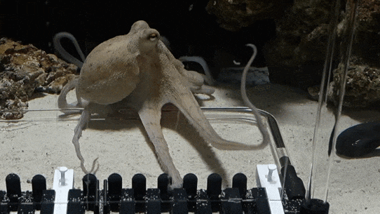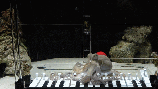 几次下来,章鱼烧真的开始反复触碰琴键,但或许是身体和运动特性所致,它只是触碰、拉动,却不向下按,琴键也就无法发出声音。