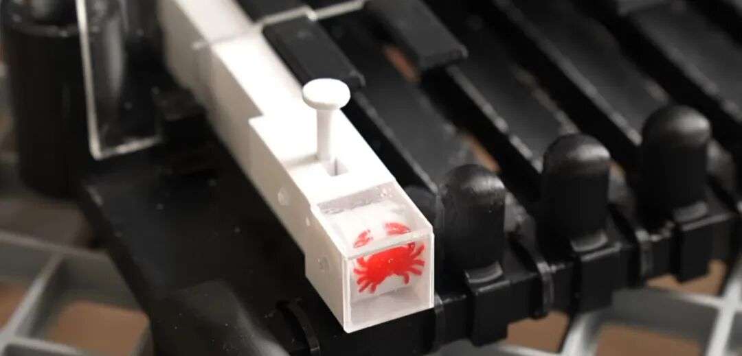 这次他用上了真的小螃蟹,把它放进一根管子里,每当章鱼烧按下一次琴键,管子就会下降一点,只有完整演奏出一整段旋律后,才能吃到螃蟹。