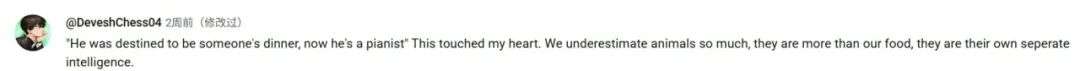 “‘他原本注定成为某人的晚餐,现在却成了一名钢琴家。’这句话真让我感动。我们太低估动物了,它们不仅仅是人类的食物,还拥有独立的智慧。“