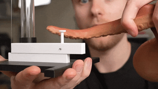 Mattias没有气馁,又是一段时间的观察后,他发现章鱼烧貌似对移动中的东西更感兴趣,于是他尝试晃动琴键上的拉杆,这次章鱼烧终于上钩,伸出触手“拉”响了正确的琴键。
