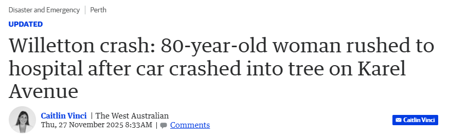 据《PerthNow》11月26日报道,周四上午,一名80岁女子在Willetton驾驶车辆时撞上一棵树,被紧急送往医院。