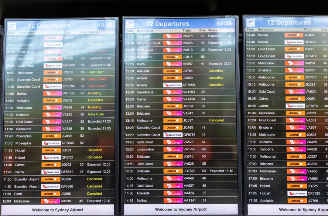 悉尼机场发布紧急通告,要求所有捷星旅客务必在前往机场前确认航班状态;阿德莱德飞往黄金海岸、凯恩斯、悉尼的多趟航班全部取消。