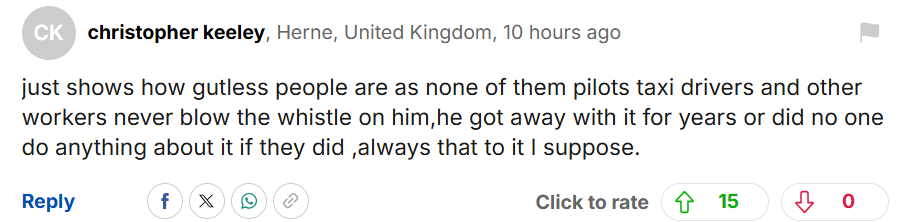 “这件事就说明普通人的胆子有多小,说白了,那些飞行员、出租车司机还有其他工作人员,就没一个人敢揭发他!