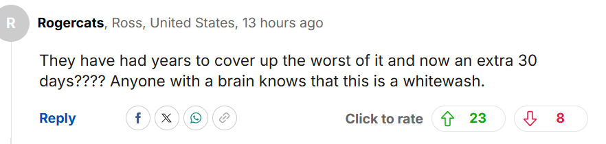 “但凡有脑子的人都会知道,他们过去好几年的时间都能收拾残局,现在还多给了30天,这根本就是在帮助他们掩盖真相。”