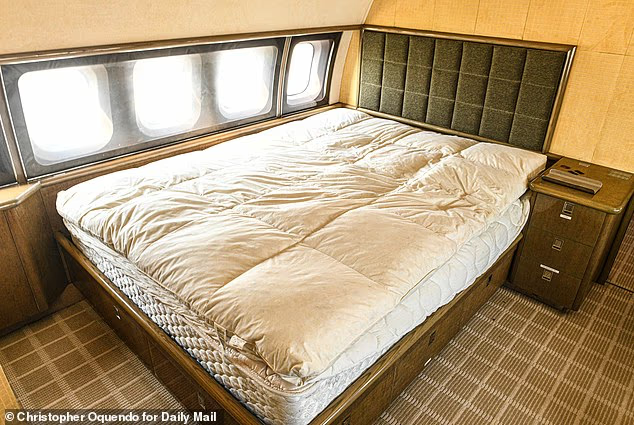 整个机舱最里面是一间摆放双人大床的房间,床上铺着厚厚的羽绒被,抽屉里码放着床单、枕巾等备用品,供客人随时更换。