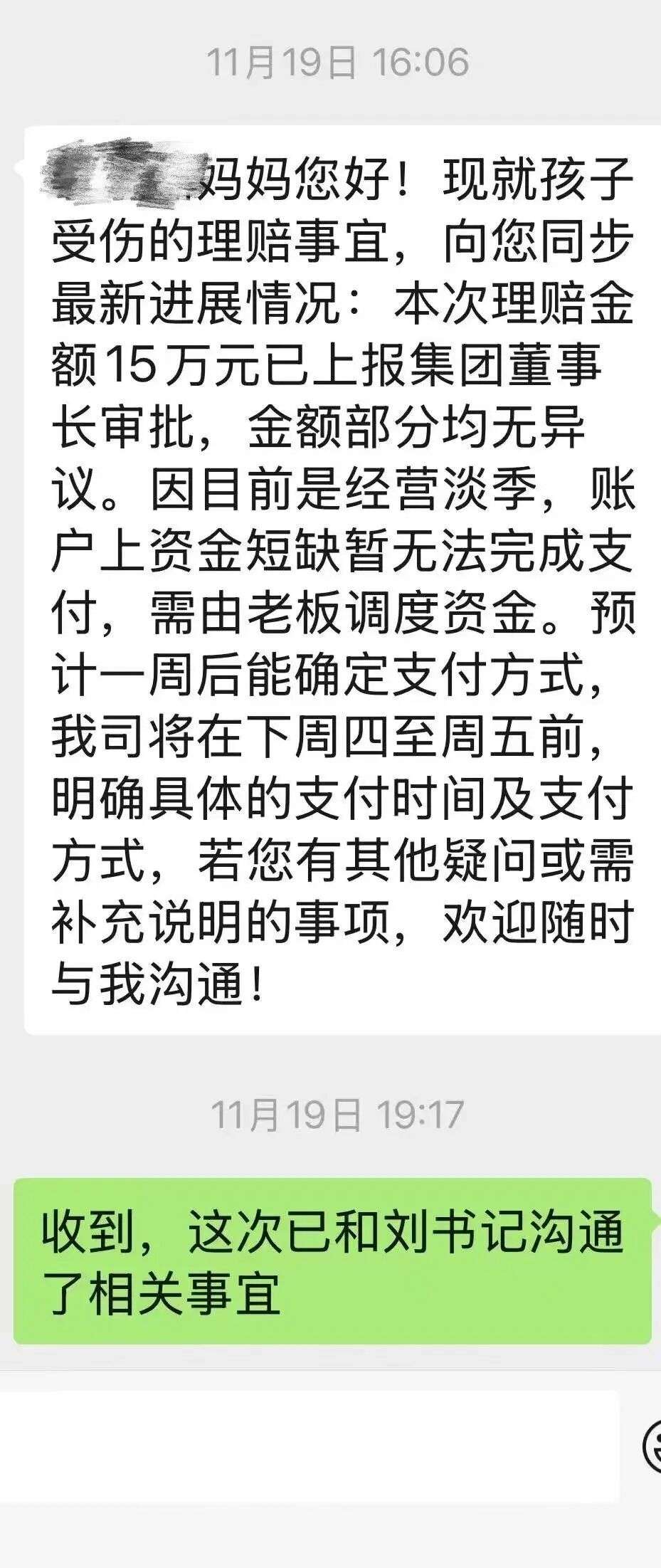 “11月18日,有相关部门给我打电话说解决这件事。去了之后园区不想谈责任问题,只谈赔偿,表示愿意给15万元赔偿,让我们给一周时间确认支付方式,我们同意了。”11月19日,该企业一名员工给陈女士发送微信,该员工称:就孩子受伤的理赔事宜,向您同步最新进展情况:本次理赔金额15万元已上报集团董事长审批,金额部分均无异议。因目前是经营淡季,账户上资金短缺暂无法完成支付,需由老板调度资金。预计一周后能确定支付方式,我司将在下周四至周五前明确具体的支付时间及支付方式。陈女士回复:收到,这次已和刘书记(当地街道书记)沟通了相关事宜。