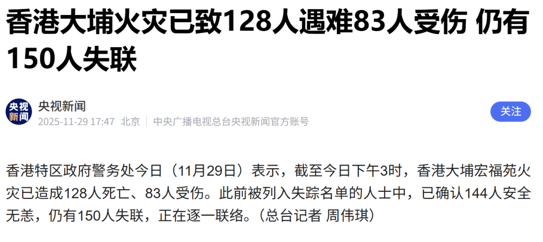 香港特区政府警务处11月29日表示,截至今日下午3时,香港大埔宏福苑火灾已造成128人死亡、83人受伤。此前被列入失踪名单的人士中,已确认144人安全无恙,仍有150人失联,正在逐一联络。