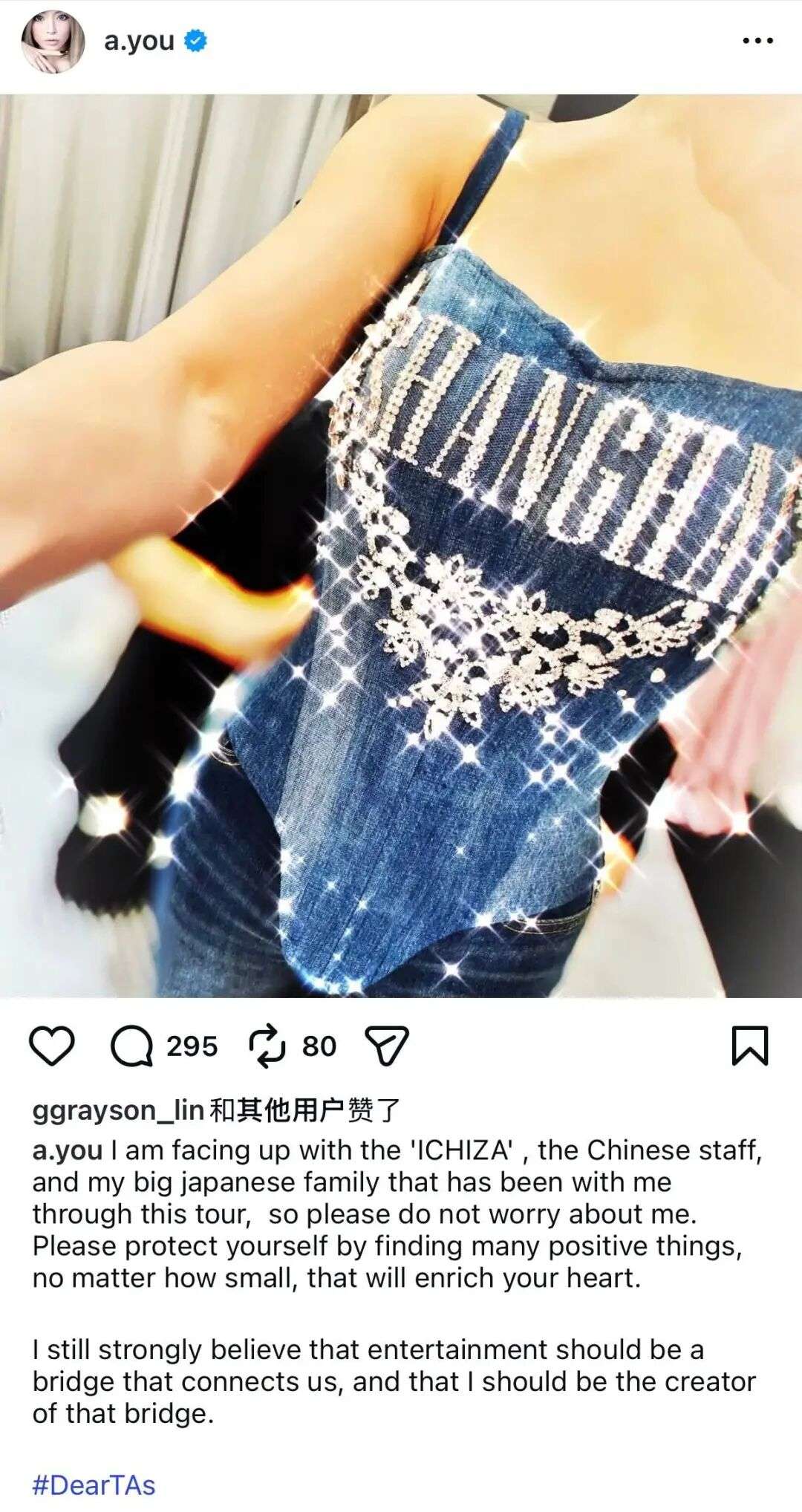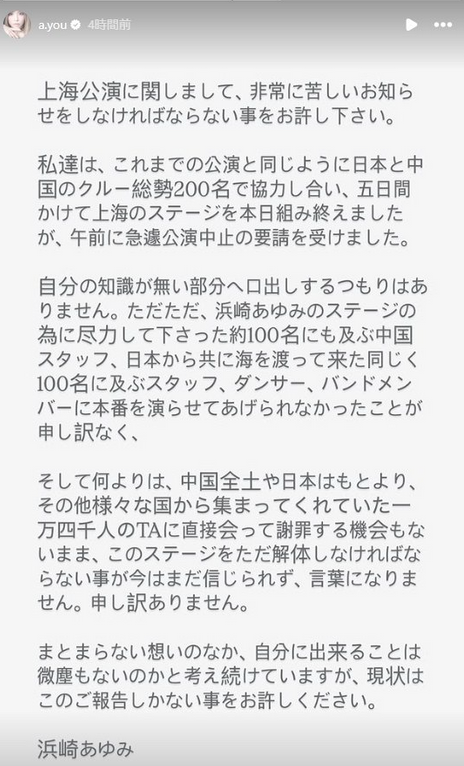最让我心痛的是,来自中国各地、日本以及其他多个国家的1万4千名TA(滨崎的粉丝"TeamAyu"),连当面致歉的机会都没有,只能将这座舞台拆除,此刻我依然无法相信这一事实,无法用语言来形容此刻的心情。真的非常抱歉。