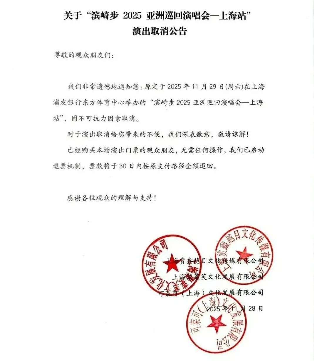 与此同时,滨崎步上海演唱会主办方可莱可文化也发布了滨崎步2025亚洲巡回演唱会上海站取消公告,表示因不可抗力因素演出取消,门票将于30日内全额退回。