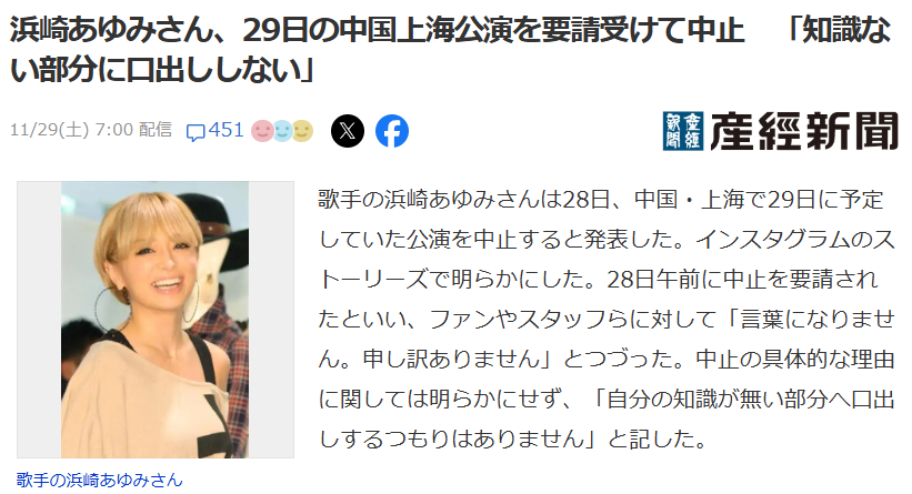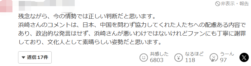 很遗憾,我认为在当前形势下这是正确的决定。滨崎女士的评论内容充满对中日两国工作人员的关怀,没有发表政治言论,虽然并非她的过错但仍向粉丝诚恳道歉,我认为作为文化人这是非常优秀的姿态。