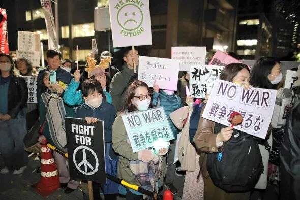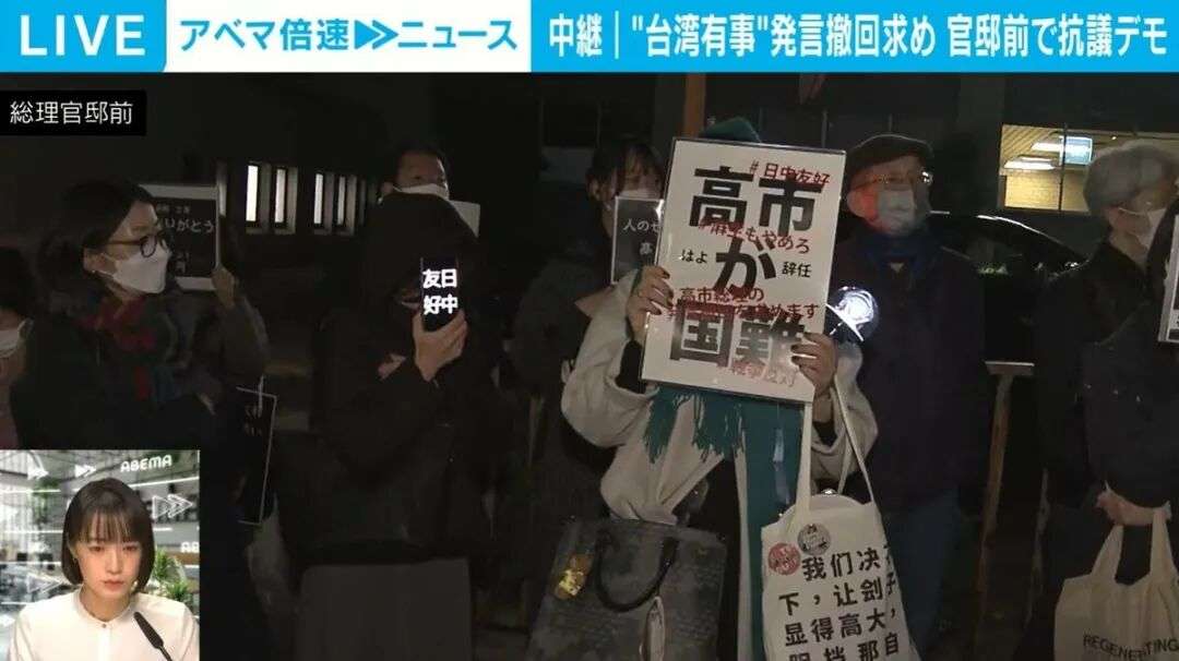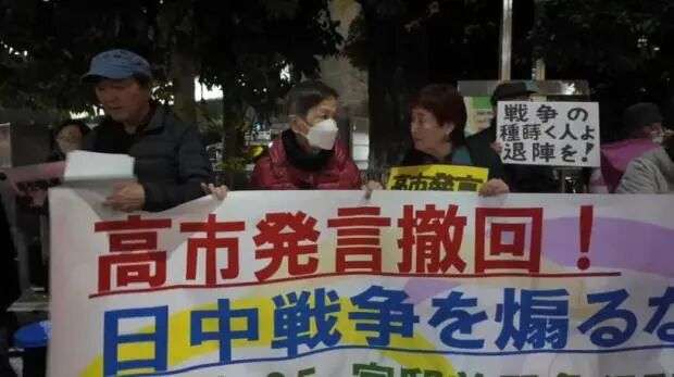 抗议者手持写有“高市辞职”“不能忘记历史,不能重蹈覆辙”等字样的牌子,要求高市撤回涉台错误言论。