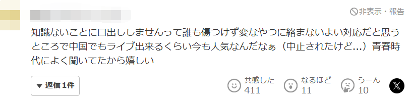 我认为"对不了解的事情不妄加评论"这种回应方式很好,既不会伤害任何人,也不会被别有用心的人纠缠。话说回来,能在中国开演唱会,说明她现在依然很有人气啊(虽然被取消了……)。我青春时代经常听她的歌,所以感到很开心。