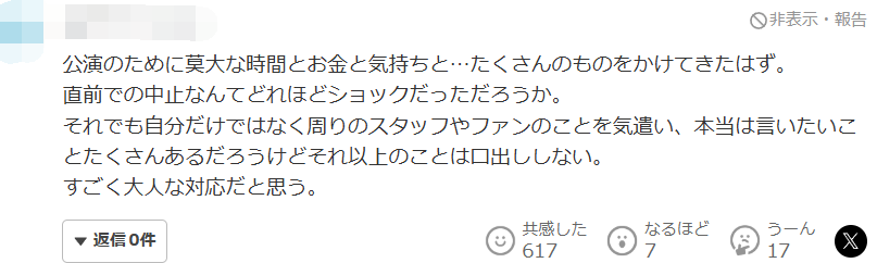 想必为这场演出投入了大量的时间、金钱、情感……许许多多的心血。在演出前夕突然取消,该是何等震惊。即便如此,她担心的不仅是自己,还顾及身边的工作人员和粉丝,心里肯定有很多想说的话,却选择不做更多评论。我认为这是非常成熟的应对方式。