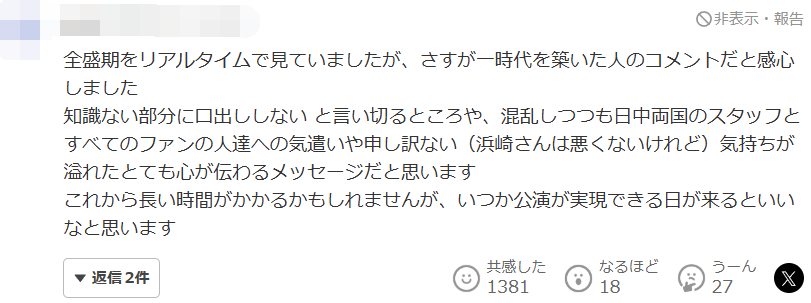 我在她巅峰时期就关注她,不愧是开创了一个时代的人,这番发言令人由衷佩服。她明确表示“对不了解的事情不妄加评论”,同时在混乱之中仍充满对中日两国工作人员及所有粉丝的关怀,字里行间流露出“虽然并非滨崎女士的错,但仍深感抱歉”的心情,我认为这是一条非常真诚、能打动人心的发文。虽然今后或许需要很长时间,但衷心希望有朝一日能够实现演出。