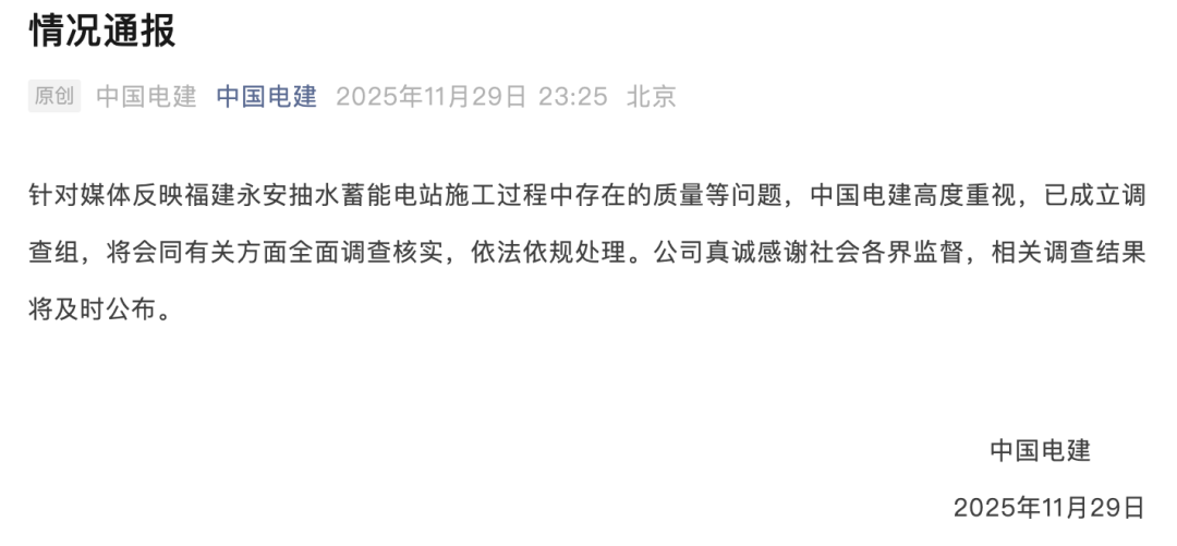 针对媒体反映福建永安抽水蓄能电站施工过程中存在的质量等问题,中国电建高度重视,已成立调查组,将会同有关方面全面调查核实,依法依规处理。公司真诚感谢社会各界监督,相关调查结果将及时公布。