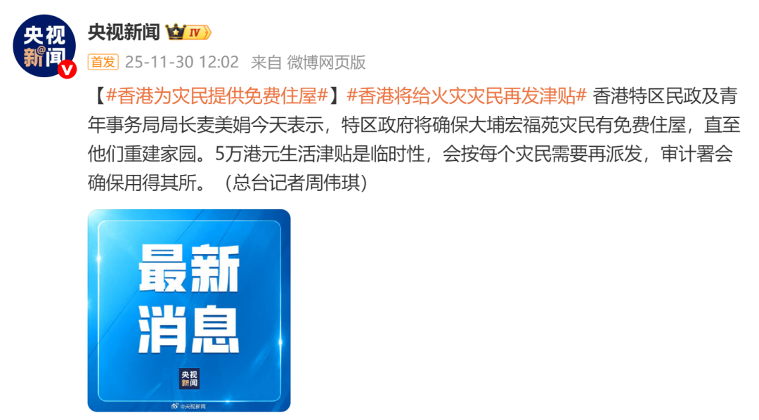 今天早些时候,香港特区民政及青年事务局局长麦美娟表示,特区政府将确保大埔宏福苑灾民有免费住屋,直至他们重建家园。5万港元生活津贴是临时性,会按每个灾民需要再派发,审计署会确保用得其所。