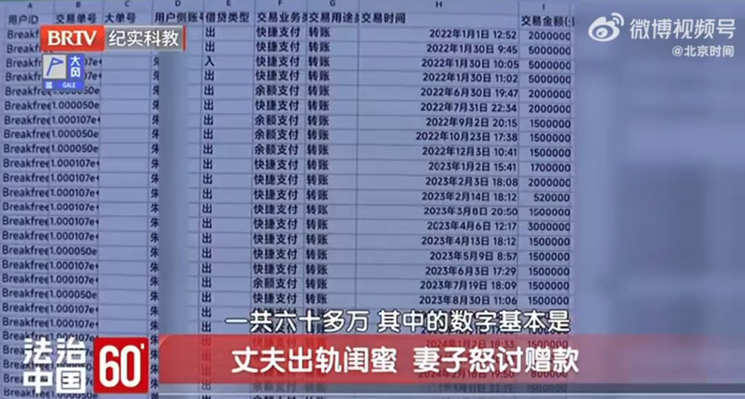 迫于无奈,冉女士起诉了刘某某和老公朱先生,“查到了(老公给刘某某的)转账记录和真实的流水,一共60多万,其中的数字基本上都是5200块钱或者1314,而我老公挣的钱被刘某某(拿去)养她家里面的全部人,所以我觉得我精神上接受不了。”